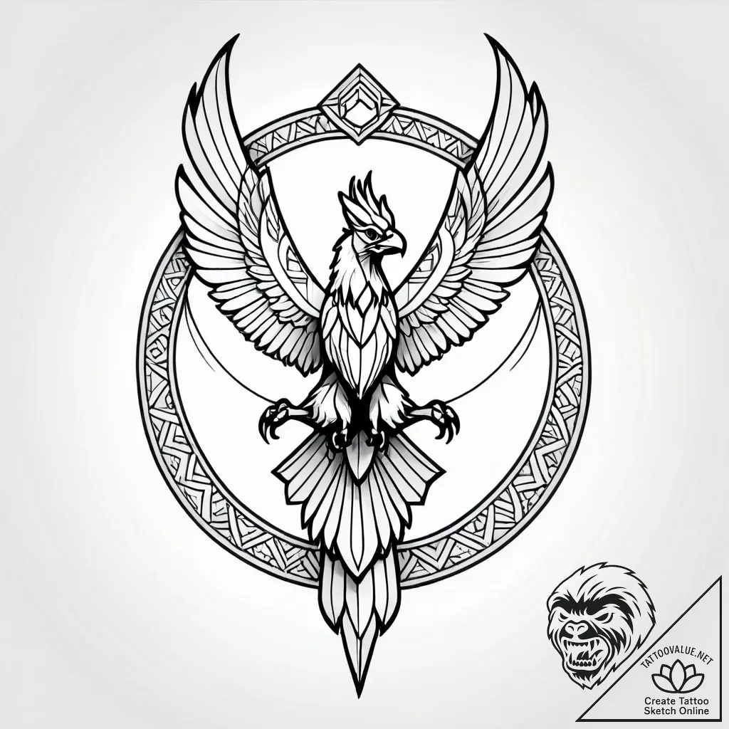 - Original User Request (RU): griffin, the guardian of treasure and knowledge, artistic tattoo sketch, clean lines, crisp outlines, sharp linework, on a clean white paper, isolated, geometric tattoo style, sacred geometry patterns, mandalas, abstract shapes, symmetrical, minimalist approach, simple forms, clean and uncluttered design, black outline only, pure linework, no shading