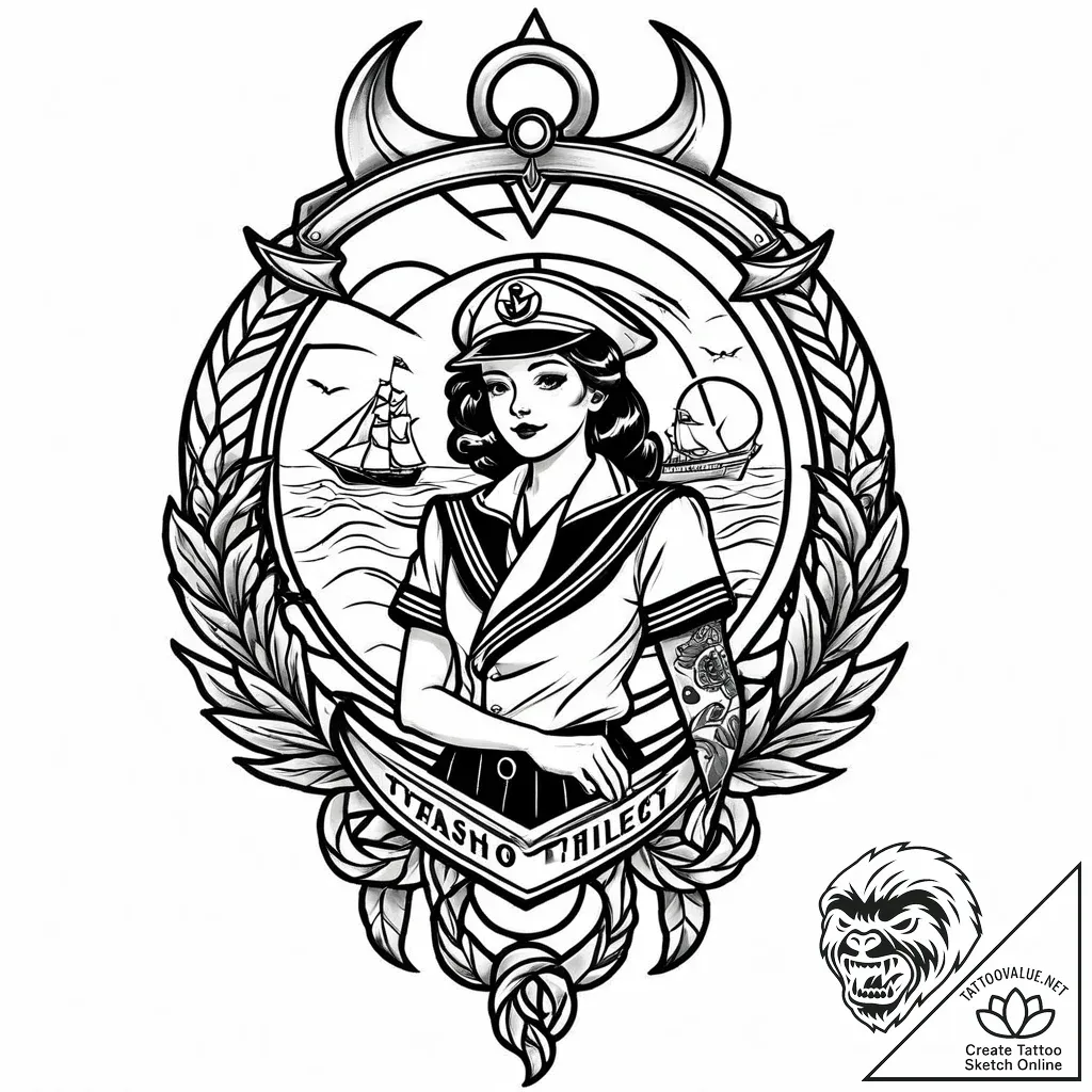 This design embodies the spirit of adventure, resilience, and the call of the open sea. The sailor motif symbolizes courage, a pioneering spirit, and the ability to navigate life's challenges with grace. The woman herself represents independence, strength, and a romanticized ideal of maritime exploration, making this tattoo a declaration of inner fortitude and a love for the journey.