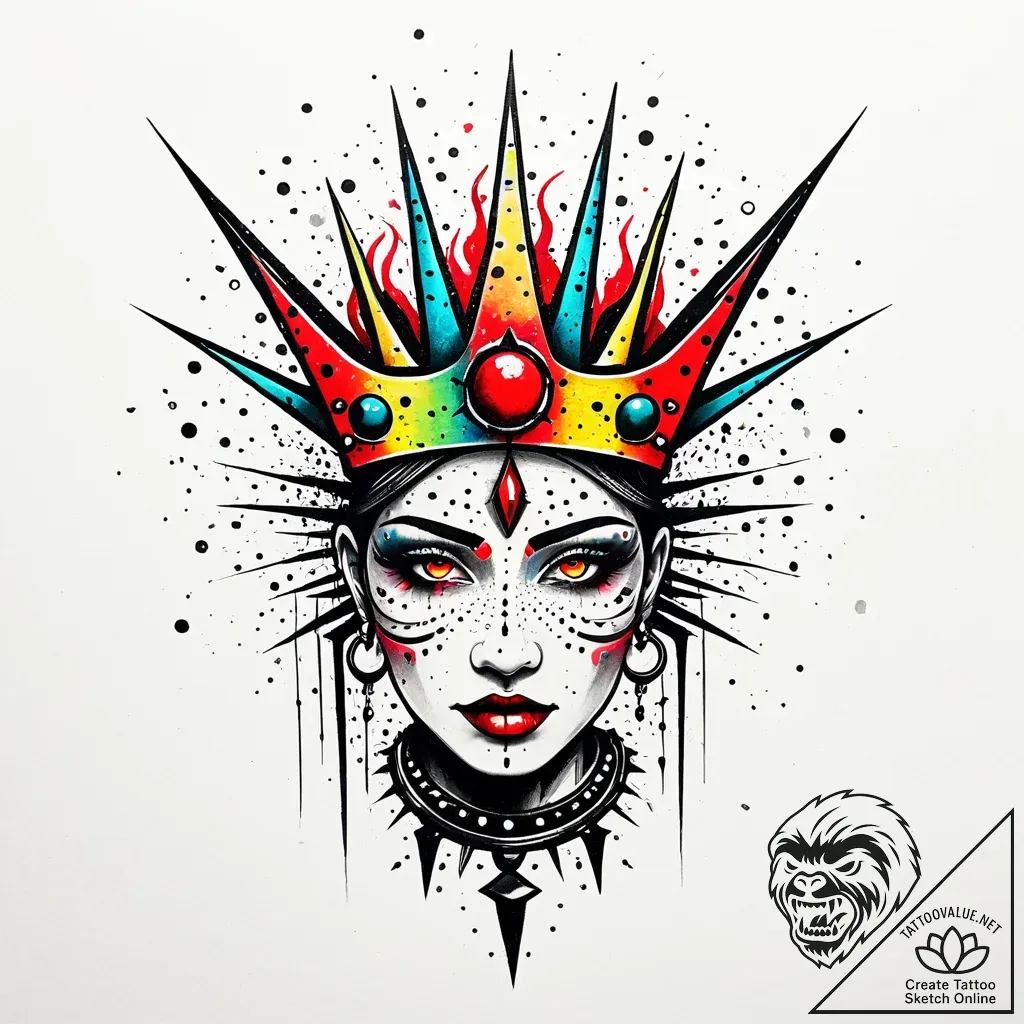 This striking sketch explodes with a Trash Polka aesthetic, featuring a crowned visage that blends abstract realism with graphic intensity. A crown of thorns, rendered in a vibrant, full-spectrum rainbow, encircles a face adorned with intense, flame-like eyes and a stippled texture that hints at ancient rituals or hidden power. The composition is a dynamic collage, utilizing bold black and red inks with minimalist forms to create a powerful, uncluttered statement.