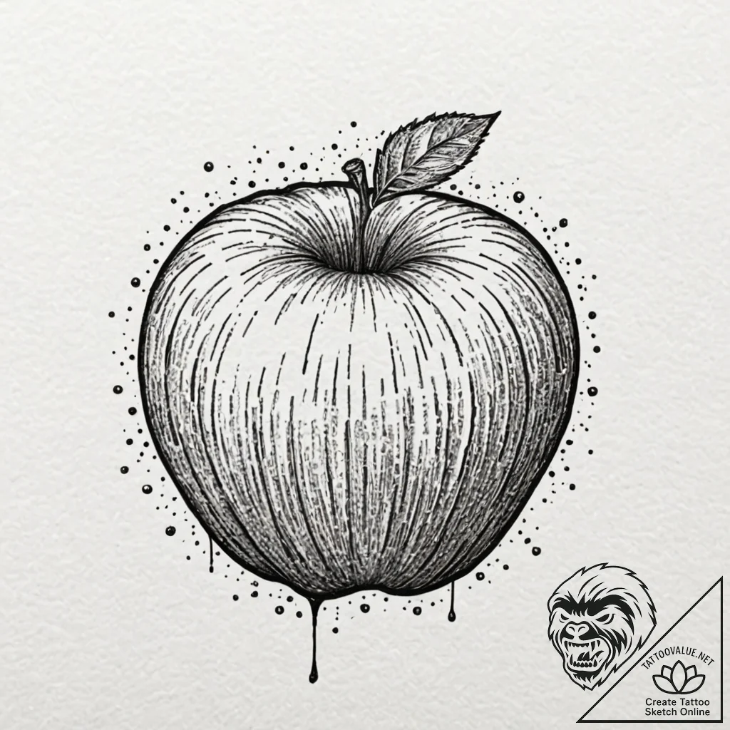 This unusual design inspired by “high-caliber bullet piercing an apple, in super slow-motion, ink illustration for tattoo, moderately detailed, balanced complexity, clear subject definition, clear image, sharp focus, vibrant colors, full color spectrum, bold bright tattoo inks, masterpiece, best quality, top-tier, rough sketchy lines, hand-drawn pencil sketch effect, artistic unfinished look, dotwork tattoo style, stippling art, pointillism, geometric dotwork, on a clean white paper, isolated” was prepared especially for you at tattoovalue.net.