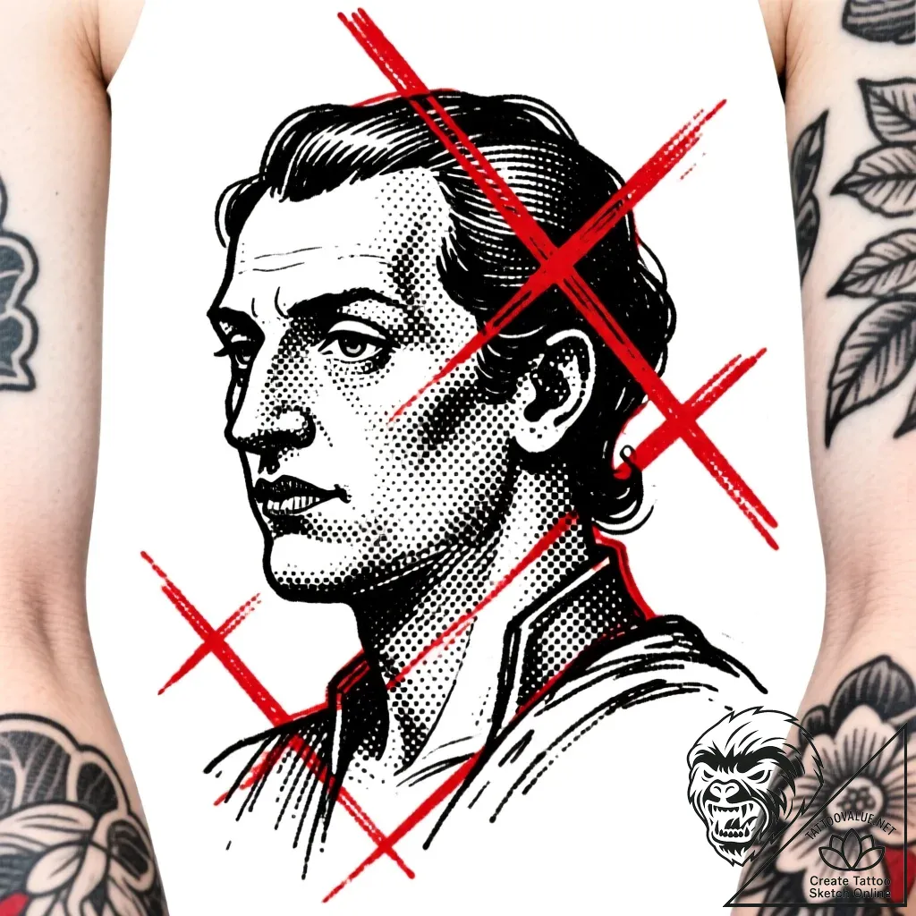 This tattoo can symbolize resilience and the overcoming of obstacles, with the red slashes representing challenges or past traumas that have been marked but not defeated. The stoic gaze of the figure suggests inner strength and determination, while the historical aesthetic hints at a deep connection to enduring values. It's a powerful statement for someone who wishes to highlight their perseverance and the indelible marks left by life's battles.