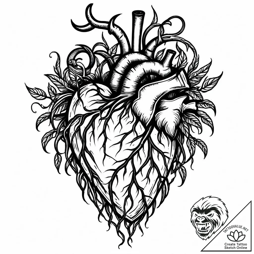 This striking blackwork tattoo sketch depicts a hollow anatomical heart, intricately entwined with a network of gnarled roots and verdant foliage. The bold, sharp linework creates a powerful graphic presence, evoking a sense of raw, untamed nature consuming the very essence of life. The composition is dynamic, with the roots forming a strong base and the vines reaching outwards, creating a visually complex and deeply symbolic piece.