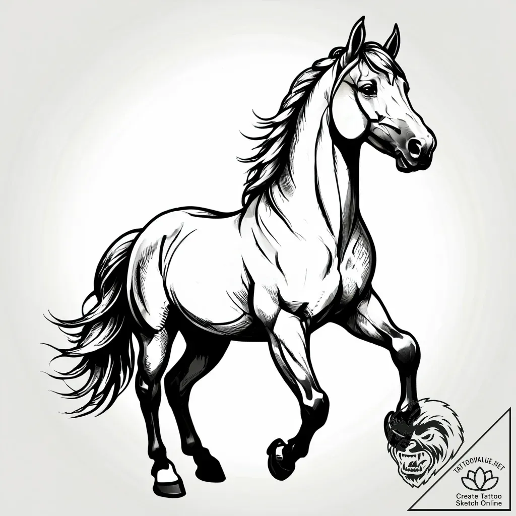 This tattoo sketch captures a horse in a moment of powerful grace, a fleeting glimpse of untamed spirit. The artist employs a masterful blend of linework and shading, creating a photorealistic effect that feels both dynamic and grounded. The flowing mane and muscular build are rendered with exquisite detail, evoking a sense of wild freedom and raw energy, as if caught mid-gallop in the warm embrace of golden hour light.
