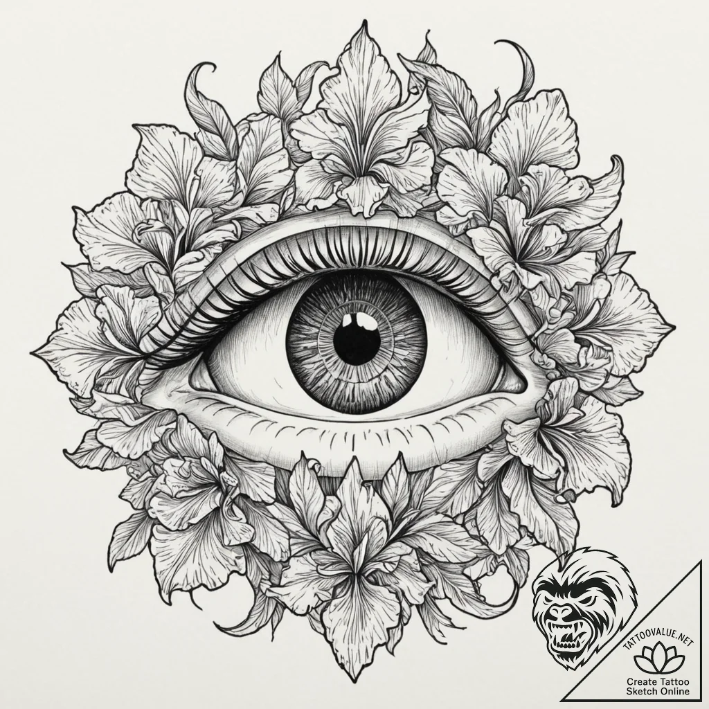 Presenting a exclusive tattoo sketch, generated based on your request “human eye with a camera shutter iris, ink illustration for tattoo, black outline only, pure linework, no shading, highly detailed, intricate patterns, complex elements, sharp details, subtle drop shadow, object casting a light shadow, neo traditional tattoo, illustrative, art nouveau influence, detailed, rich colors, aesthetically pleasing, beautiful design, fine lines, delicate linework, single needle style” at tattoovalue.net.