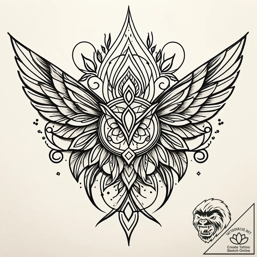 This striking design is a symphony of sharp linework and intricate detail, resembling a celestial emblem born from a dream. Its composition, reminiscent of an unfolding lotus or a stylized owl's wings, radiates outward with a graceful, symmetrical elegance, evoking a sense of ethereal protection and ancient wisdom.
