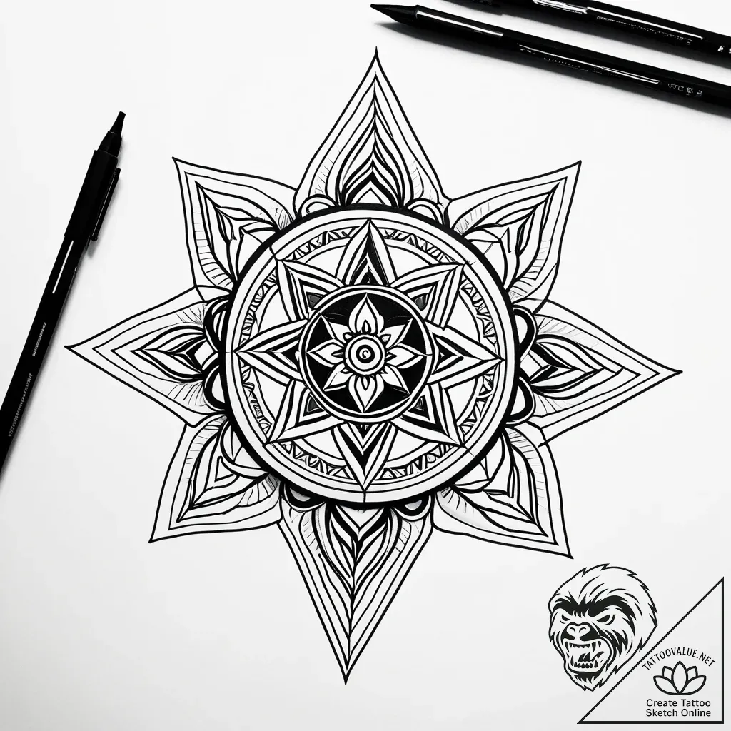 This tattoo sketch unfolds like a blossoming star, a geometric mandala radiating outward from a central, watchful eye. The bold, unwavering linework creates a captivating interplay of symmetry and abstraction, resembling a complex puzzle box waiting to be unlocked. It’s a graphic statement, a testament to precision and the beauty found within structured chaos.
