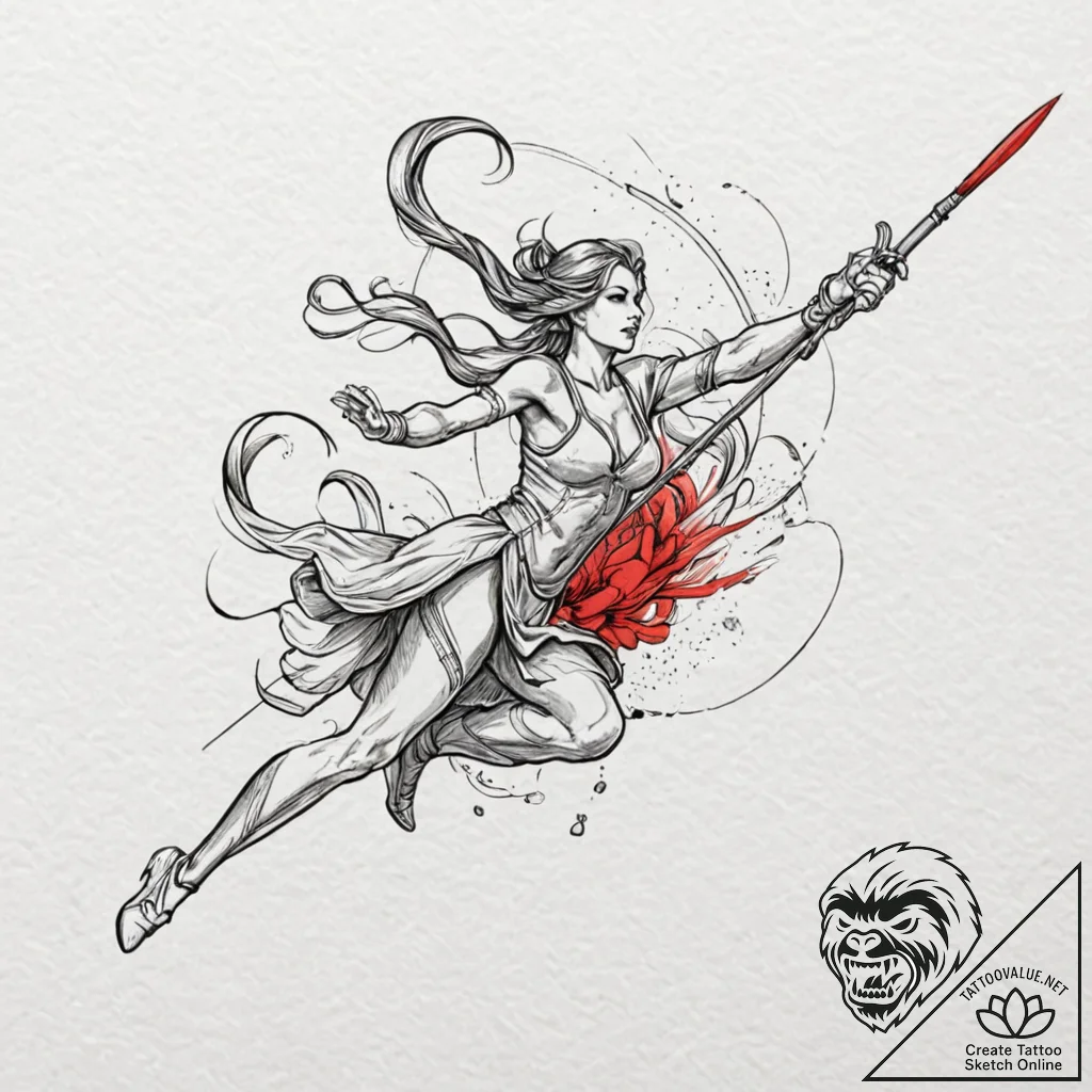 - Original user request (RU): javelin (the weapon) in mid-flight, trailing fire, tattoo sketch design, bold outlines, thick lines, heavy linework, neo traditional tattoo, illustrative, art nouveau influence, detailed, rich colors, professional artwork, expertly drawn, moderately detailed, balanced complexity, clear subject definition, black and red ink, red accent, dramatic two-tone, on a clean white paper, isolated