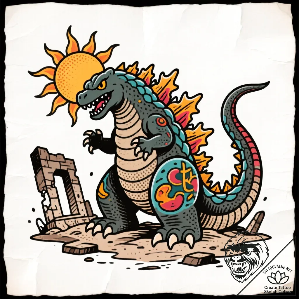 This New School tattoo sketch bursts with vibrant energy, depicting a colossal kaiju rising triumphantly from ancient, crumbling ruins under a blazing sun. Rendered in a sepia-toned, vintage paper aesthetic, the design masterfully blends soft whip shading, pepper shading, and smooth dot shading to create depth and texture, reminiscent of bold graffiti art and classic tattoo flash.