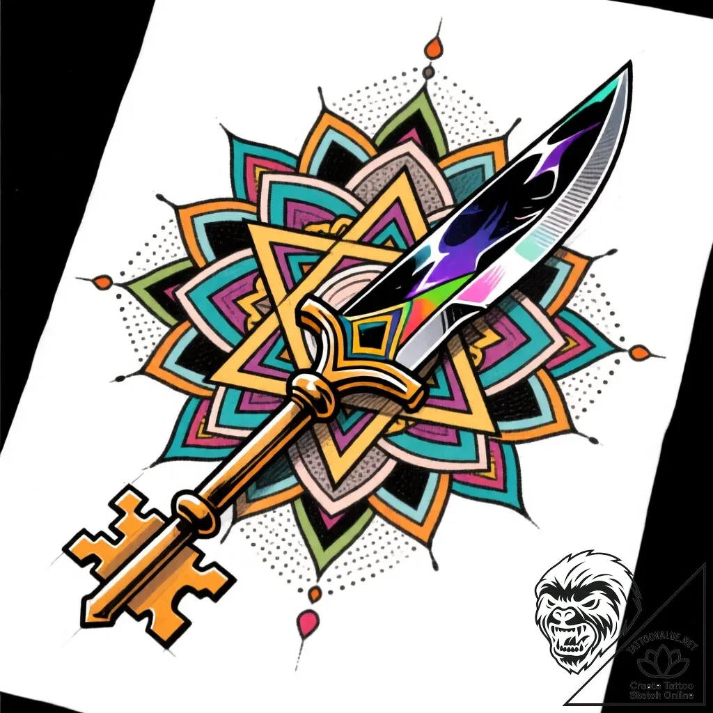 This vibrant tattoo sketch is a mesmerizing fusion of the geometric and the arcane, where a gleaming key, a symbol of access, is dramatically pierced by a sharp, obsidian blade. The intricate mandala,
