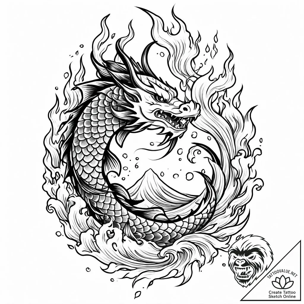 This Irezumi-style sketch portrays a powerful dragon, a serpentine embodiment of primal energy, locked in a perpetual dance with tempestuous flames and crashing waves. The pure linework, rendered with intentionally rough, sketchy lines, evokes the raw, untamed spirit of a hand-drawn pencil sketch, giving it an artistic and unfinished look that hints at the immense power contained within. The graphic stylization and artistic interpretation create a dynamic composition, capturing the essence of a mythical beast mastering the elements.