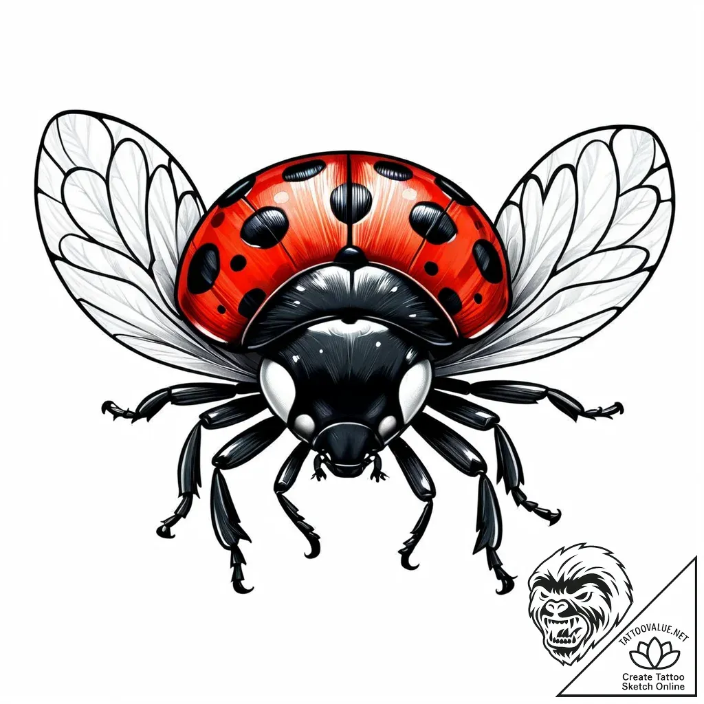 This sketch captures a ladybug poised for flight, its vibrant red carapace, dotted with obsidian spots, shimmering like a miniature jewel under an unseen sun. Delicate, transparent wings unfurl, hinting at the freedom of the sky, while the intricate details of its segmented body and spindly legs are rendered with a graphic precision, evoking a sense of both nature's artistry and the permanence of ink.