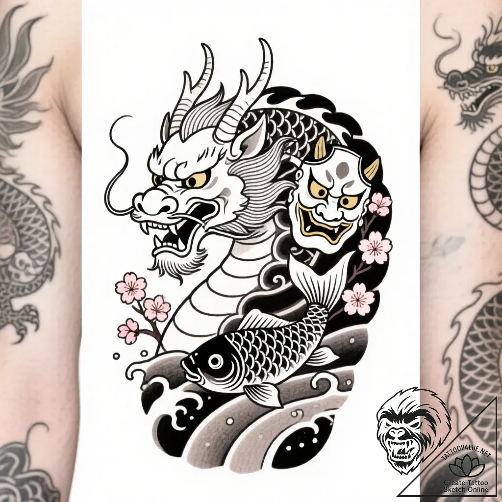 This Irezumi-style sketch breathes life into the mythical manticore, weaving it with classic Japanese motifs. The delicate, single-needle linework creates a tapestry of traditional imagery, where a fierce dragon coils around a stoic Hannya mask, accompanied by the determined journey of a koi fish against stylized waves and fleeting sakura blossoms. The muted color palette evokes the aged charm of vintage tattoos, presenting a composition rich in narrative and visual harmony.