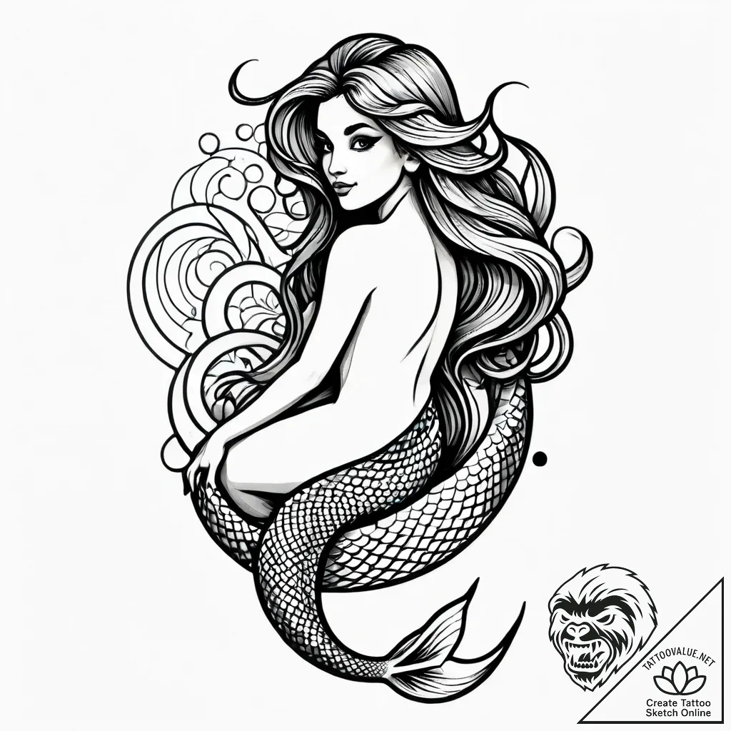 This sketch is ideal for individuals who appreciate artistic detail and possess a free-spirited, enigmatic personality. It would look striking on the forearm or calf, allowing the flowing lines of the tail and hair to accentuate the natural curves of the limb. Alternatively, placed on the back between the shoulder blades, it would create a powerful, almost mythical presence.