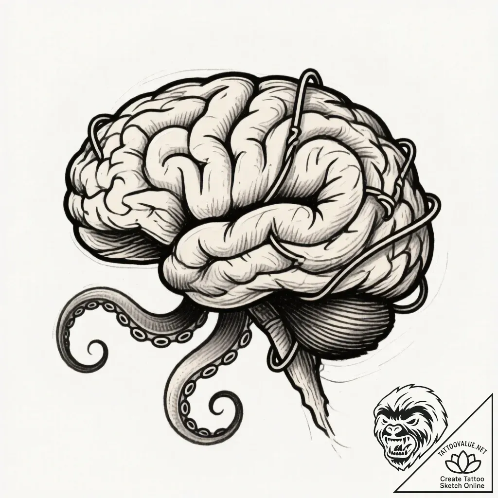 - Original User Request (RU): mind-flayer (illithid) with tentacles wired into a brain, tattoo flash sheet design, rough sketchy lines, hand-drawn pencil sketch effect, artistic unfinished look, stylized interpretation, graphic style, artistic stylization, sketch tattoo style, hand-drawn effect, rough lines, unfinished artistic look, cross-hatching, muted color palette, desaturated colors, vintage tattoo feel, unique design, original concept, on a clean white paper, isolated, aesthetically pleasing, beautiful design
