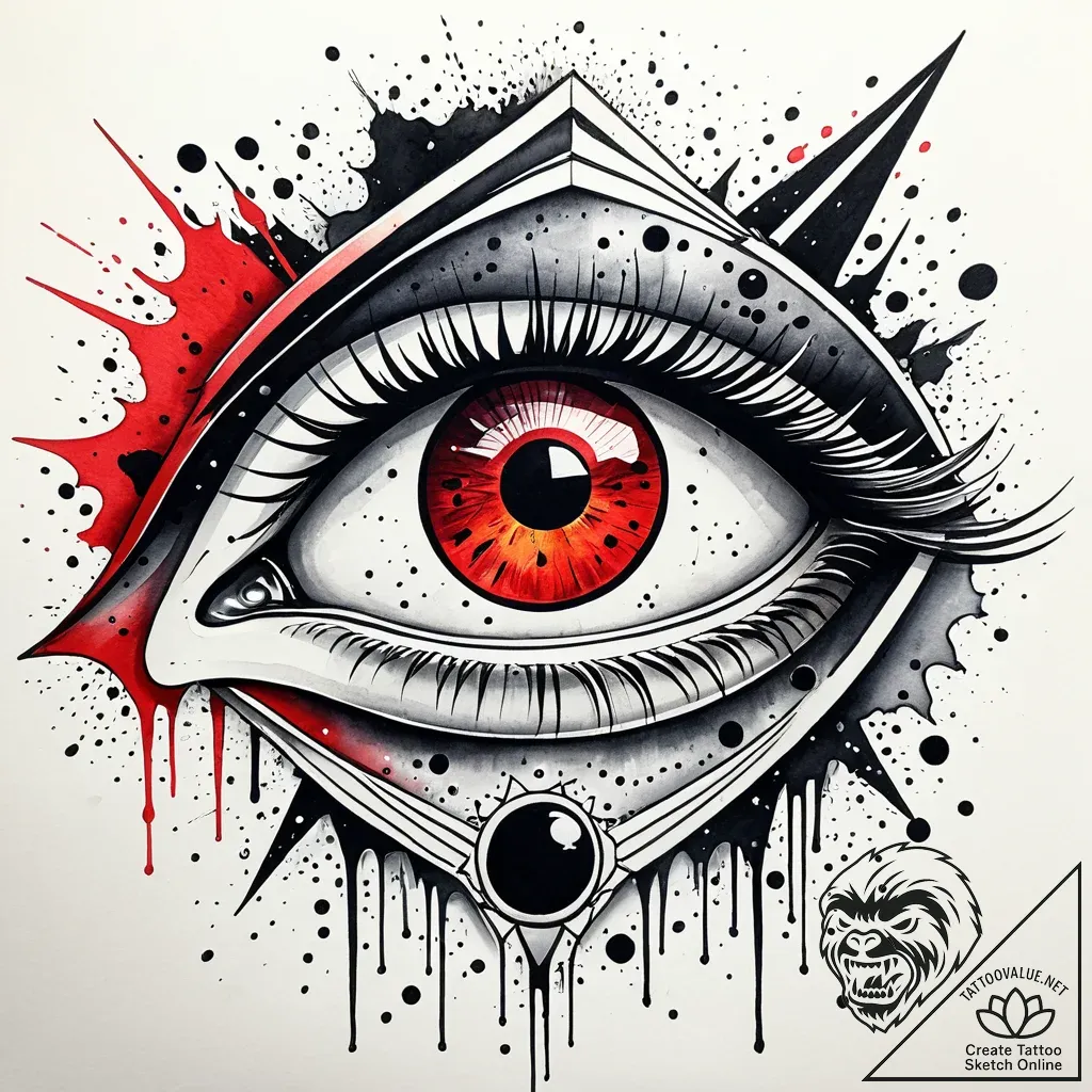- Original User Request (RU): observatory dome opening to reveal a giant, unblinking eye, tattoo flash sheet design, watercolor tattoo style, artistic splashes, vibrant blended colors, no outlines, abstract watercolor, black and red ink, red accent, dramatic two-tone, on a clean white paper, isolated, dotwork shading, stippling texture, pointillism effect for tattoo, stylized interpretation, graphic style, artistic stylization
