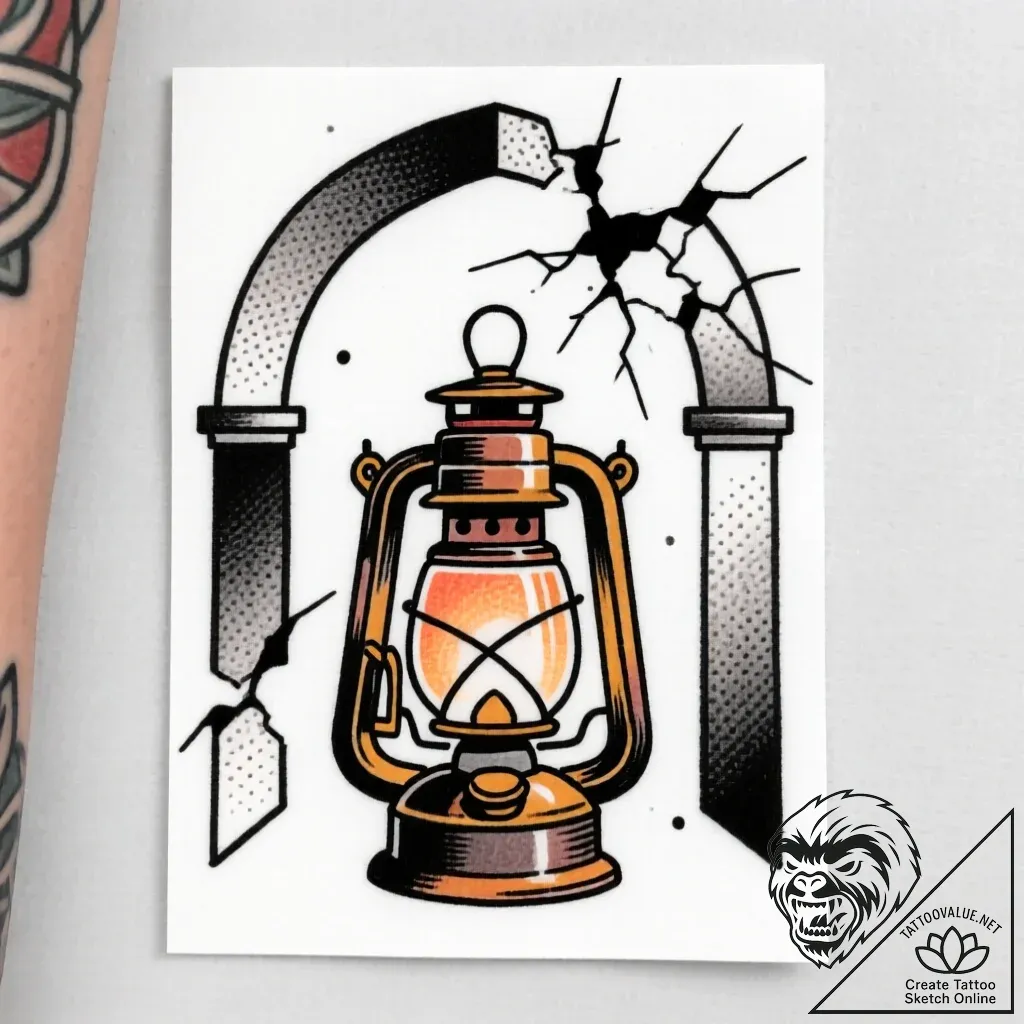 Oil lamp beneath cracked arch, tattoo sketch... - style Flux Inscriptions - tattoo sketch (23.12.2025 17:57)