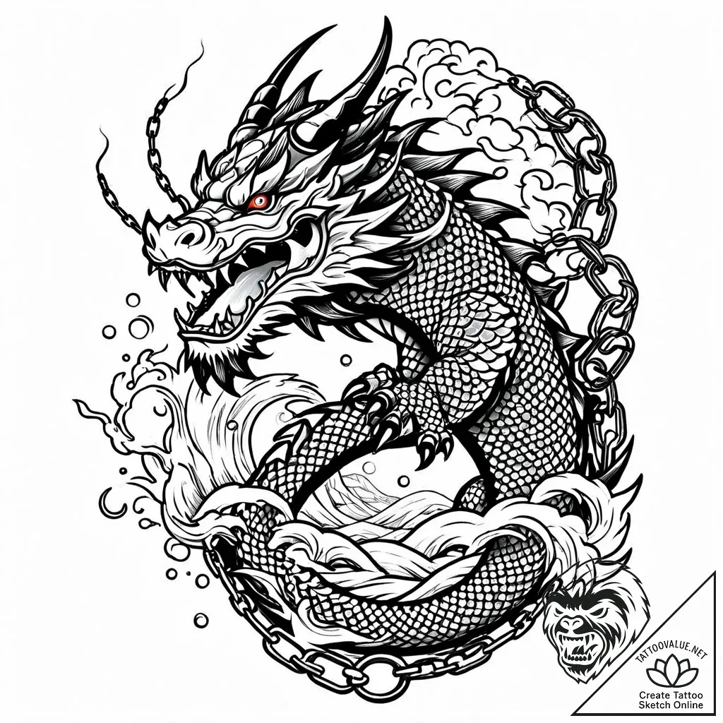 The dragon, a cornerstone of East Asian mythology, symbolizes strength, wisdom, and good fortune. Coupled with the chains, it represents the overcoming of limitations or the mastering of inner turmoil, while the turbulent waves speak of resilience and adaptability. This design can signify a powerful individual who embraces challenges and possesses an unyielding spirit.