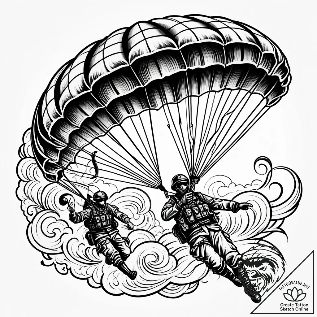 This neo-traditional sketch captures the thrilling descent of paratroopers, rendered in pure linework with a dynamic composition that screams movement. The intricate details of the parachutes and gear, inspired by Art Nouveau's flowing lines, create a sense of controlled chaos as the figures navigate a stylized cloudscape.