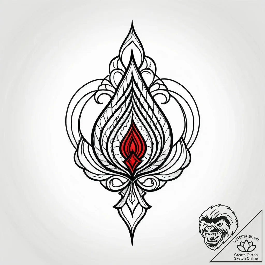 This striking tattoo sketch unfolds like a stylized flame or an exotic bloom, its intricate linework a delicate dance between sharp precision and flowing elegance. The monochromatic base, executed with fine, single-needle finesse, is dramatically punctuated by a vibrant crimson heart, suggesting a powerful internal energy contained within an ornate, almost architectural form.
