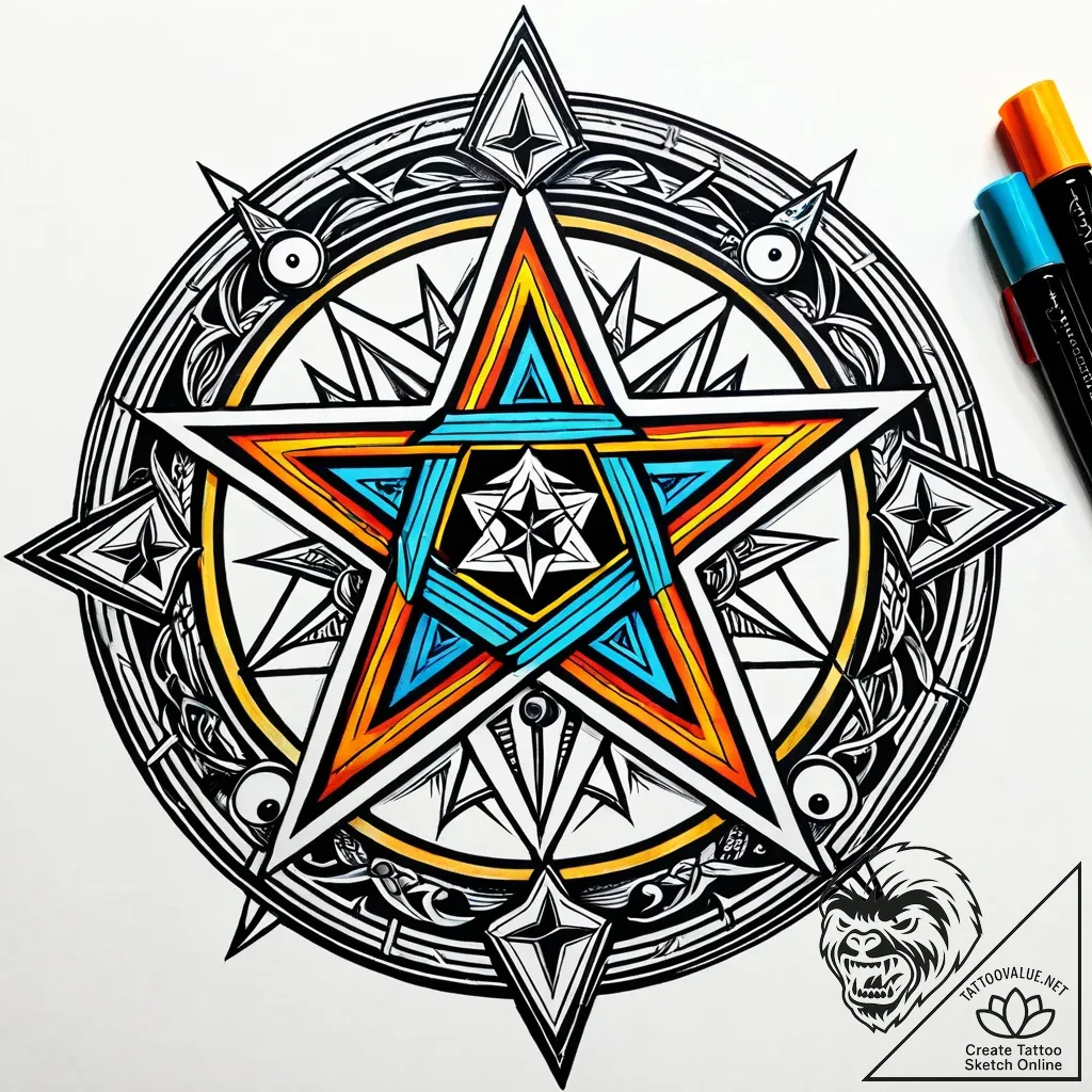 This electrifying pentagram sketch pulsates with an inner fire, its bold outlines and vibrant, full-spectrum colors evoking the raw energy of old-school American traditional tattoos. Intricate arcane
