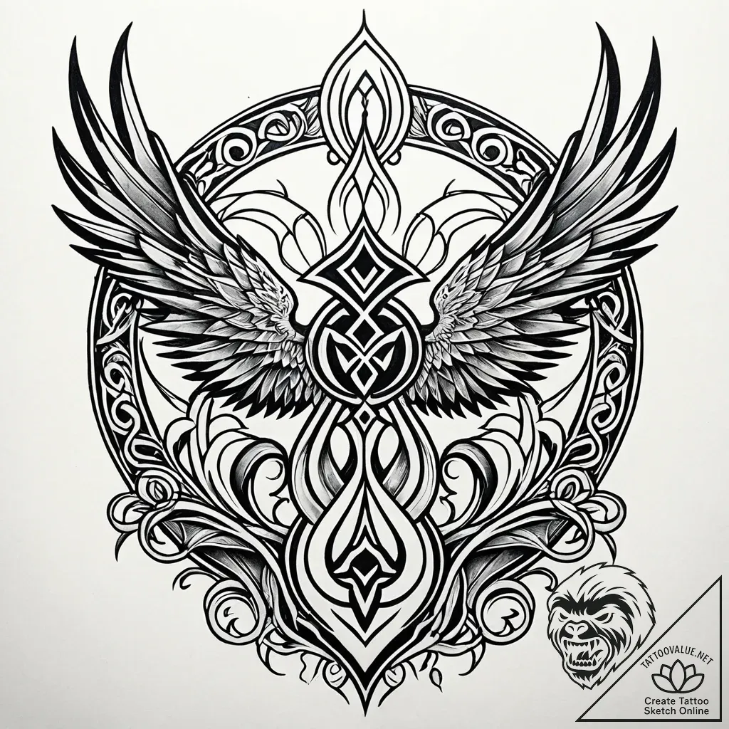 This neo-traditional tattoo sketch is a majestic convergence of celestial wings and ancient runic symbolism, rendered with the bold, confident lines of a master engraver. It evokes the feeling of a mythical sigil carved into eternal stone, its balanced complexity and clear definition hinting at profound, untold stories.