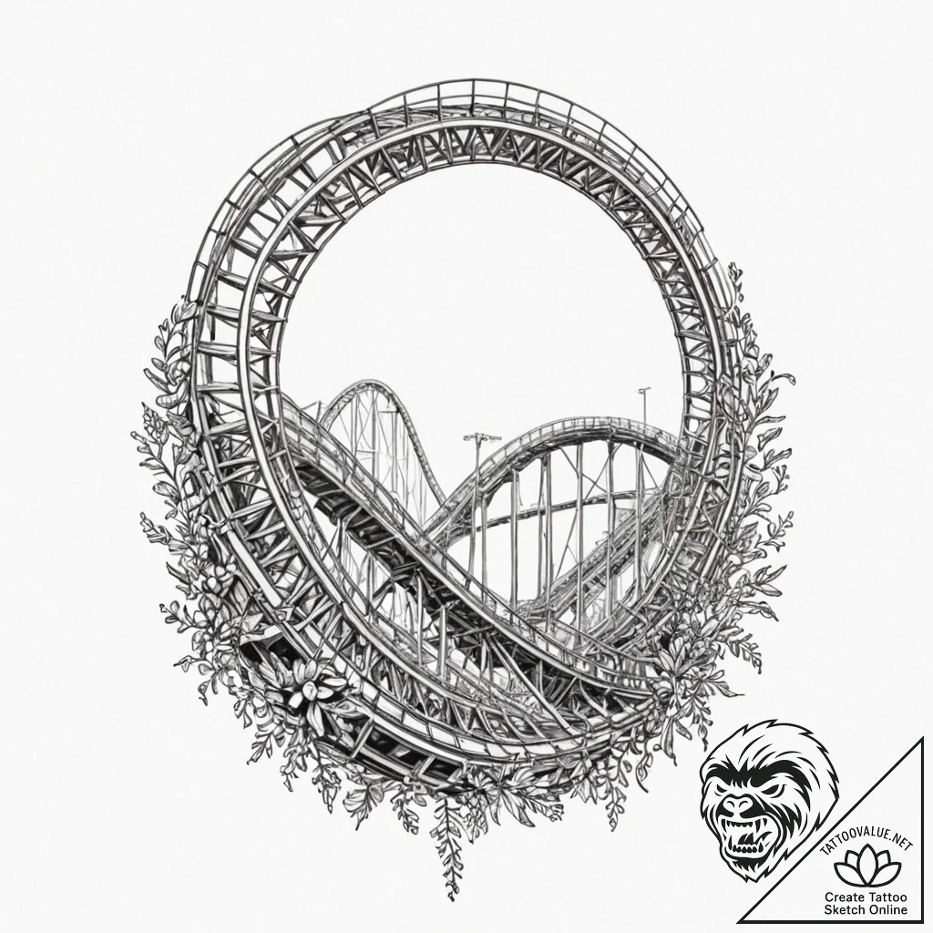 Tattoo sketch: rollercoaster, tattoo sketch design, black and white sketch, monochrome, greyscale tones, soft whip shading, pepper shading, smooth dot shading, minimalist tattoo design, simple clean l