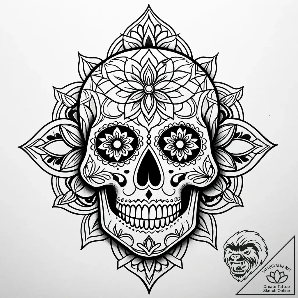 This striking black and white sketch captures a sugar skull adorned with intricate mandala patterns, a visual symphony of sacred geometry and delicate linework. The composition is a balanced dance bet