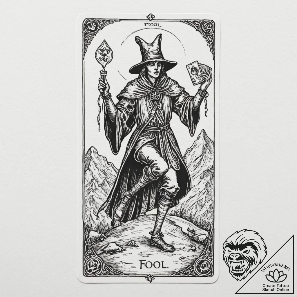 Tattoo sketch: Tarot card (e.g., The Fool, The Magician, Death).