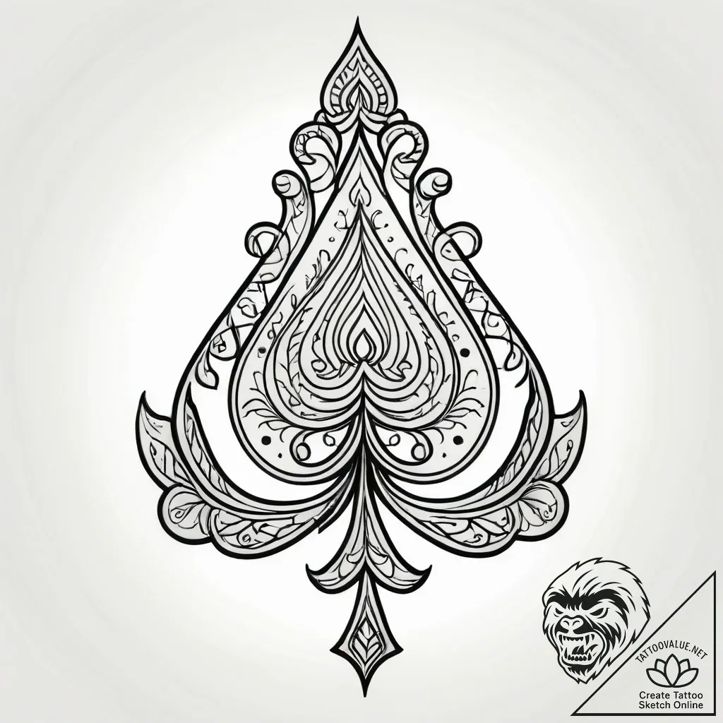 This sketch is an exquisite fusion of a classic spade symbol and ornate filigree, resembling a delicate, antique jewel. Its graphic linework, softened by subtle dotwork and whip shading, creates a dep