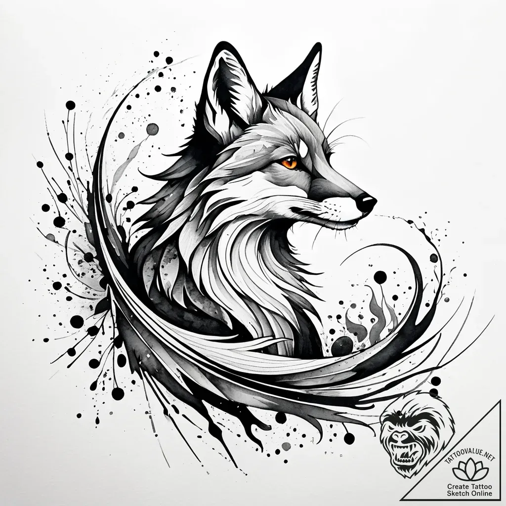 This sketch captures the essence of a fox in a dynamic, abstract watercolor style. The fox's silhouette emerges from a vortex of swirling geometric shapes and textured splashes, reminiscent of ink bleeding on wet paper. The monochrome palette, punctuated by vibrant orange eyes, creates a striking contrast, evoking a sense of both wild energy and thoughtful contemplation. It's a modern interpretation, where fine lines and delicate linework blend seamlessly with bold, artistic splashes, giving the impression of a fleeting, spirited moment frozen in time.