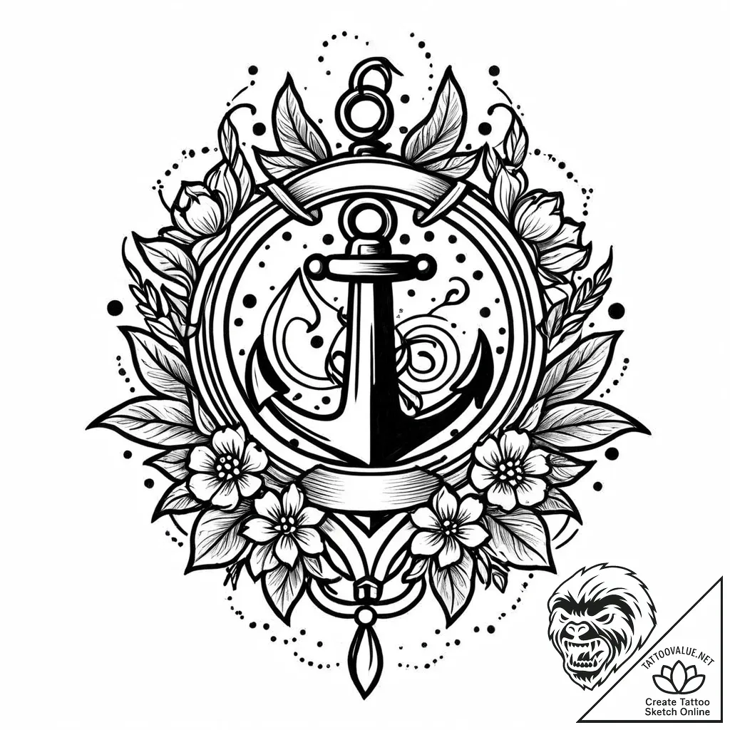 This tattoo sketch is a captivating dance between classic American Traditional and delicate floral artistry. The bold anchor, a steadfast symbol, is embraced by a blossoming wreath, rendered with a gr