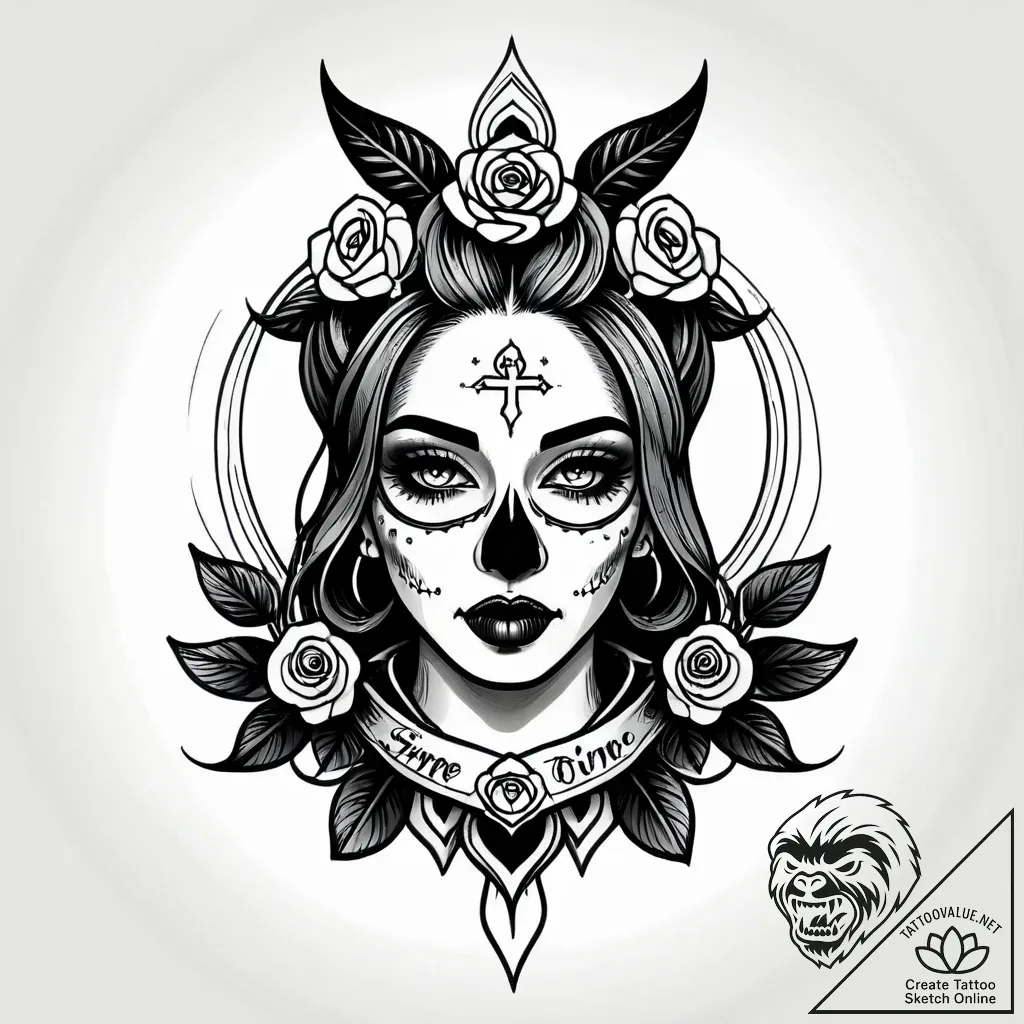 This Chicano-style sketch is a captivating portrait, evoking the spirit of Dia de los Muertos with its striking sugar skull makeup and elaborate floral crown. The bold linework and smooth black and gr