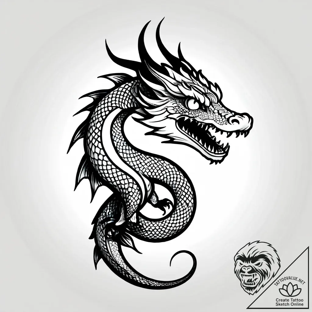 This intricate linework dragon is ideal for individuals who appreciate bold yet detailed artistry and embody qualities of strength and resilience. It would look impressive as a statement piece on the forearm, allowing the serpentine coils to wrap around the limb, or as a dynamic design on the calf, adding a powerful visual element to the leg.