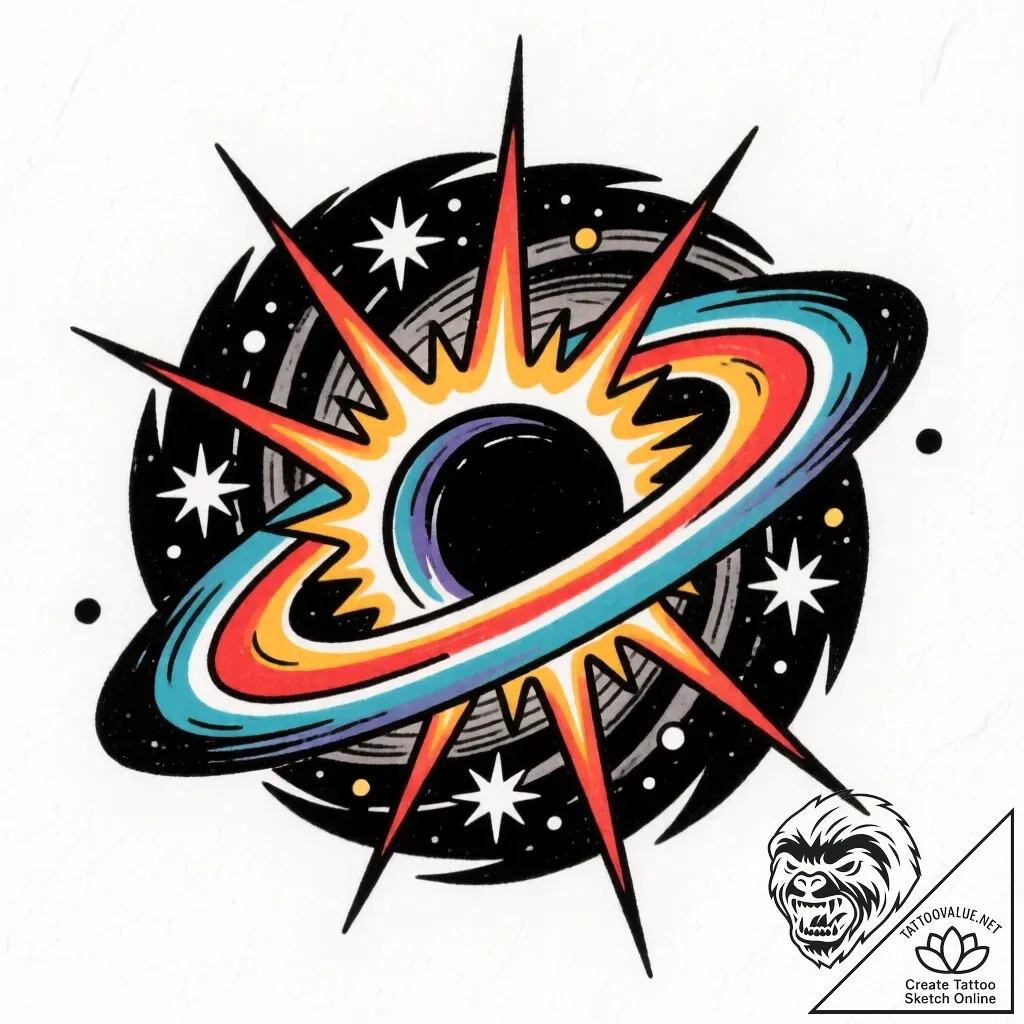 This tattoo sketch is a vibrant vortex of cosmic energy, rendered in the bold, iconic style of old school traditional American tattooing. A central black hole, a void of infinite possibility, is encircled by a radiant halo of rainbow hues, reminiscent of a celestial ring, while sharp, starburst lines explode outwards, all set against a backdrop of classic dotted stars and swirling nebulae.