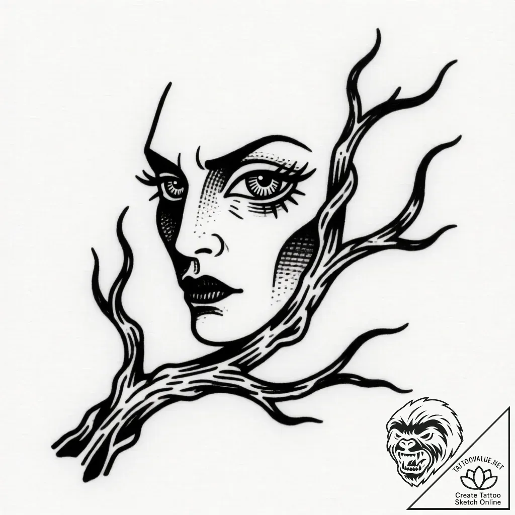 This striking tattoo sketch presents a face emerging from the sinuous embrace of a twisting branch, its eyes holding the weight of untold stories. Rendered in a classic American traditional style with