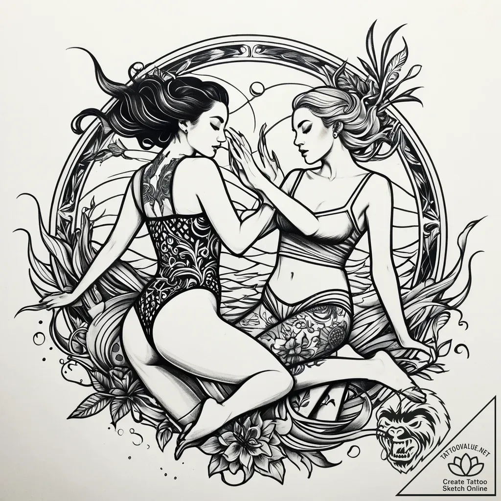 - Original User Request (RU): tat tattoo sketch, bronagh and saoirse swimming together, graceful tattoo, tattoo flash sheet design, blackwork tattoo style, dark art, bold black areas, heavy black ink, muted color palette, desaturated colors, vintage tattoo feel, clean lines, crisp outlines, sharp linework, on a clean white paper, isolated