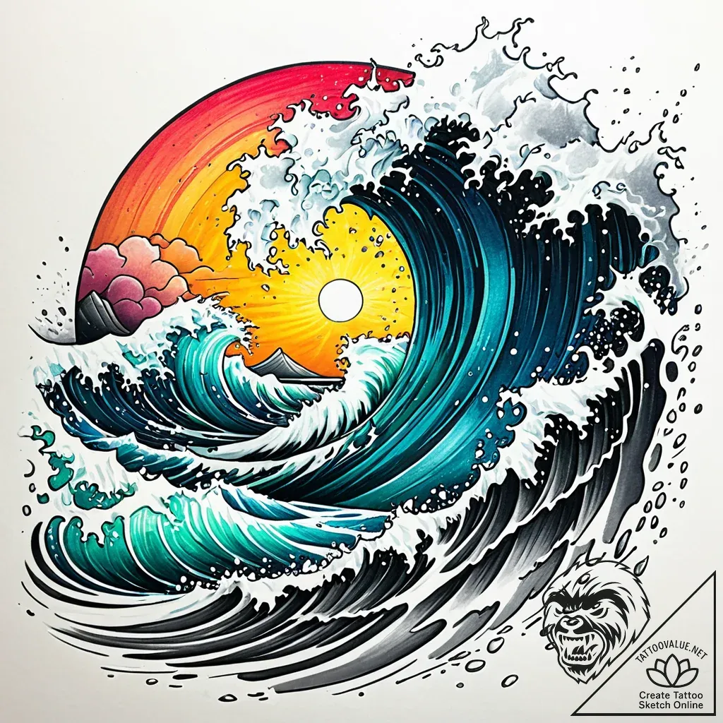The crashing waves symbolize immense power, transformation, and the cyclical nature of life, representing both challenges and the strength to overcome them. The inclusion of the sun or moon adds a layer of duality, signifying balance, illumination, and guidance through life's turbulent waters. This tattoo can embody resilience, adaptability, and a profound connection to the elemental forces.