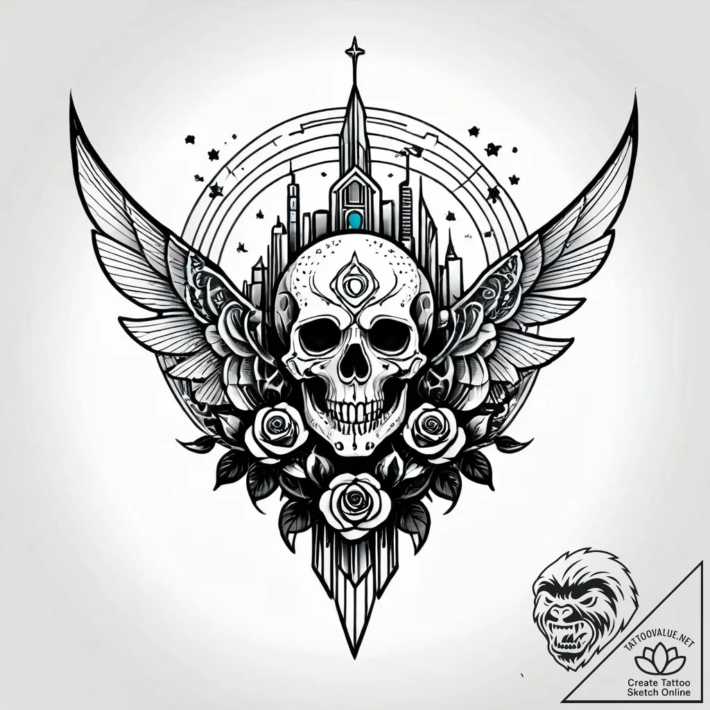 This striking black and white sketch merges the stark beauty of a chicano-inspired skull with a dystopian cyberpunk cityscape, creating a visual narrative of resilience amidst urban decay. The composition is a symphony of fine lines and dotwork shading, evoking a sense of ethereal grandeur with the ornate wings and celestial halo framing the central skull, while the surrounding roses offer a poignant contrast of organic life against the metallic future.
