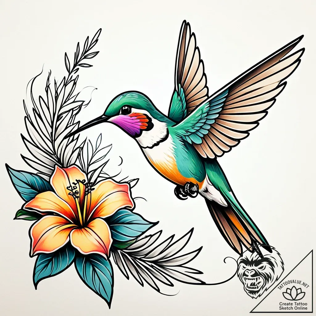 • Original User Request (RU): tat tattoo sketch, delicate colibri bird feeding on tropical flower, soft feminine tattoo, ink illustration for tattoo, on a clean white paper, isolated, muted color palette, desaturated colors, vintage tattoo feel, fine lines, delicate linework, single needle style, new school tattoo style, vibrant colors, cartoonish, graffiti art inspired, exaggerated forms