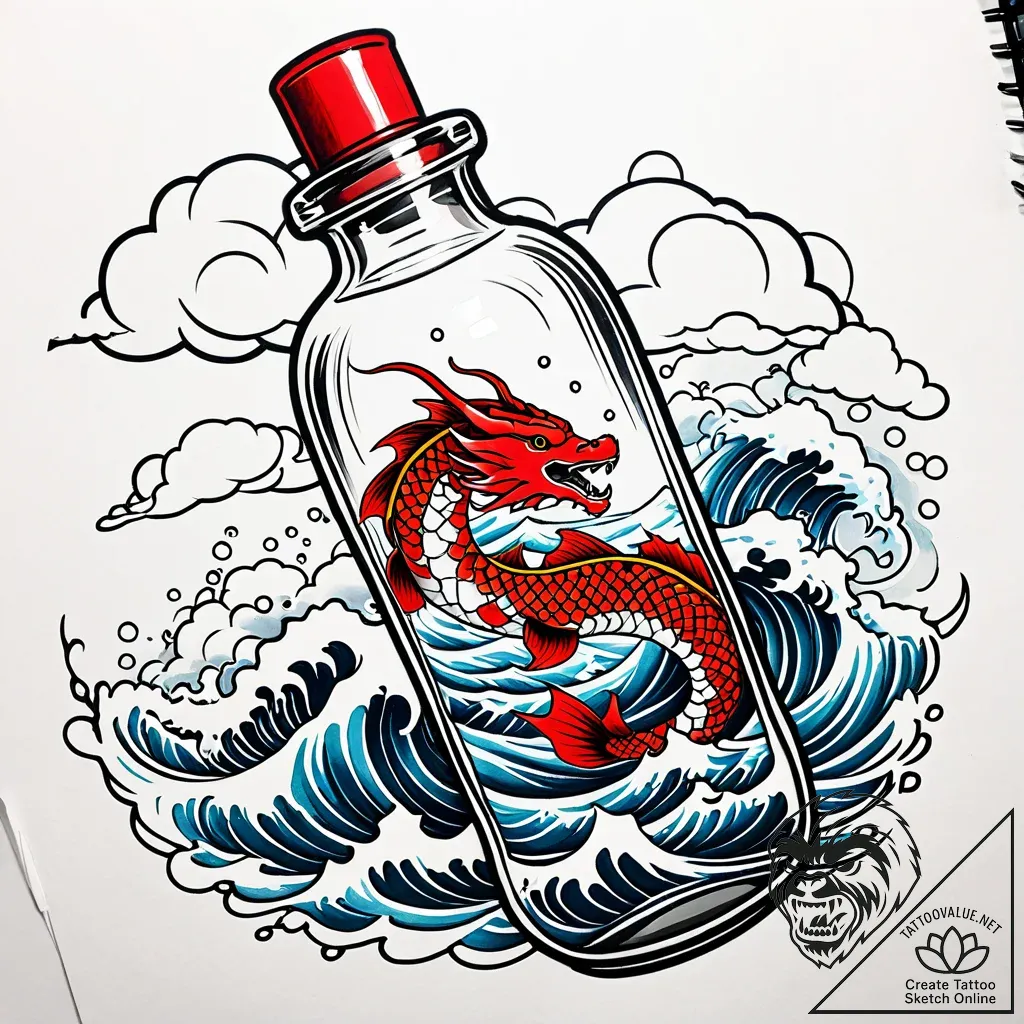 This tattoo sketch presents a captivating scene: a fiery red dragon, a symbol of untamed power, is contained within the delicate glass of a ship-in-a-bottle. The dynamic interplay of swirling waves, r