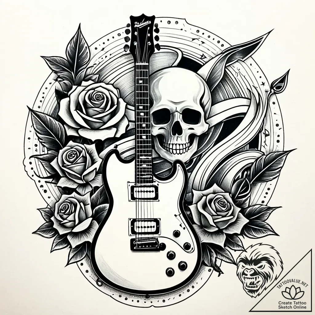 This design embodies the duality of existence, where the vibrant passion of music (represented by the guitar) intertwines with the inevitable passage of time and the beauty of remembrance (symbolized by the roses and skull). It speaks to a soul that embraces life's intensity while acknowledging its transient nature, exuding a timeless, rebellious spirit.