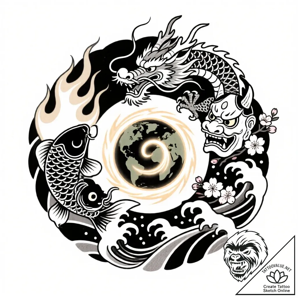 This striking Irezumi-inspired design masterfully weaves the primal forces of nature into a dynamic, glowing spiral. A majestic dragon, a stoic Hannya mask, leaping koi, and crashing waves form a powe