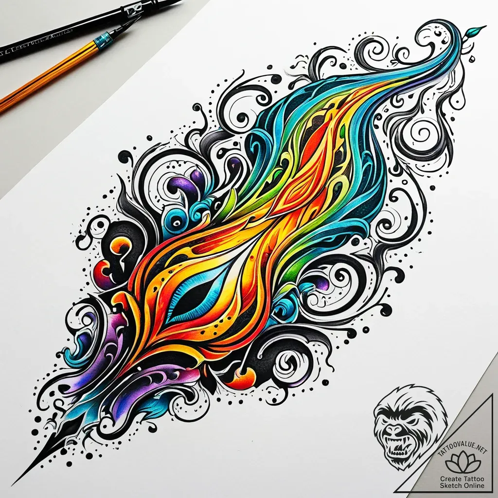 This sketch is a vibrant, surreal explosion of color and form, reminiscent of a phoenix feather forged in the heart of a volcano. The central element pulses with molten lava textures, transitioning through a full spectrum of bold, bright inks, while delicate linework and filigree create an ornamental dance around it. The intricate details and flowing patterns evoke a sense of dynamic energy, a graphic masterpiece with subtle dotwork elements that whisper tales of creation and transformation.