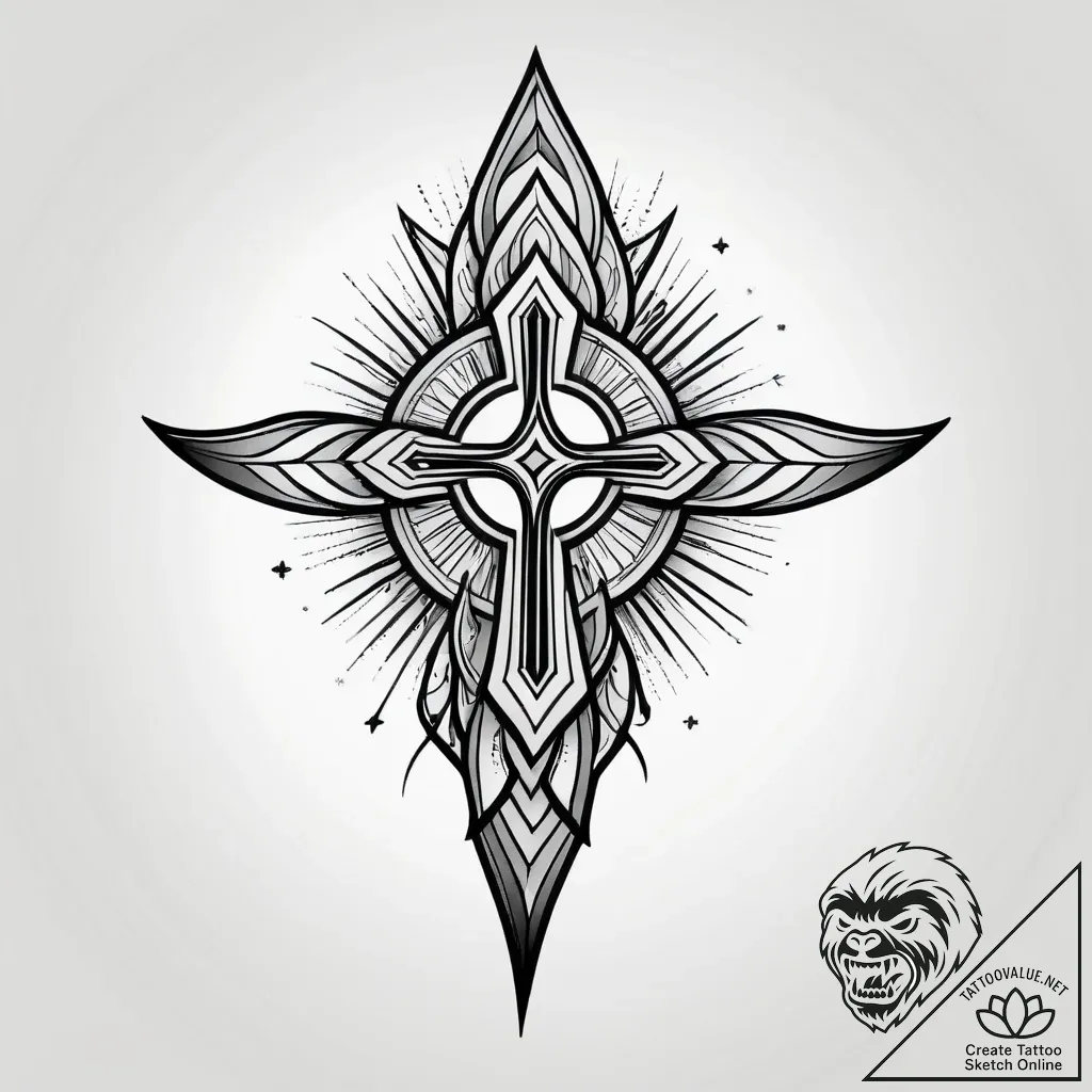 The cross, a universal symbol of faith, sacrifice, and redemption, is amplified here by abstract, energetic elements that speak to a profound spiritual connection and inner power. It represents an unwavering devotion, a guiding light, or a personal journey towards enlightenment. This design can symbolize resilience, the triumph of spirit over adversity, and a deep-seated belief in a higher purpose.