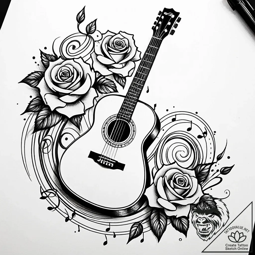This sketch masterfully blends the soulful melody of a guitar with the timeless romance of roses, rendered in a clean, graphic linework style. The composition flows like a song, with swirling music notes and delicate rose petals entwined around the instrument, creating a visual symphony. The absence of shading emphasizes the purity of the design, allowing the bold black outline to speak volumes.