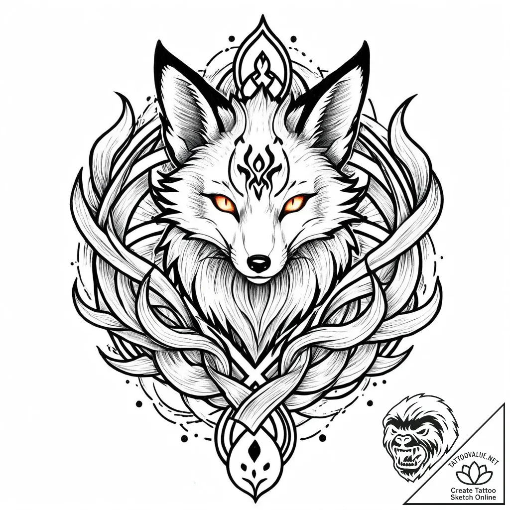 This striking sketch features a Kitsune, a mythical fox spirit from Japanese folklore, rendered in a pure linework, black outline style. The creature's piercing, glowing eyes are the focal point, set against an intricate display of flowing, stylized tails and interwoven decorative elements, reminiscent of ancient knotwork and evoking a sense of ethereal power. The detailed cross-hatching shading adds depth and texture, transforming the minimalist design into a captivating piece of art.