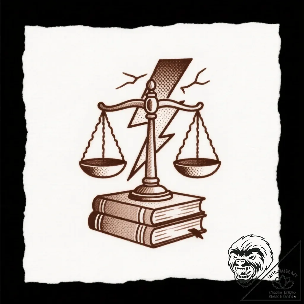 - Original User Request (RU): tat tattoo sketch, lawyer’s scales and books with lightning strike behind, justice power tattoo, tattoo sketch design, sepia tone sketch, vintage paper look, on a clean white paper, isolated, minimalist tattoo design, simple clean lines, tiny tattoo, subtle design, soft whip shading, pepper shading, smooth dot shading
