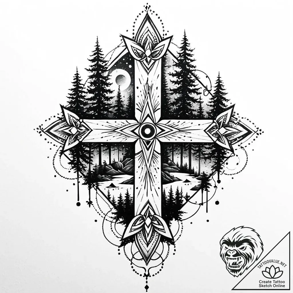 This sketch presents a striking cross, not as a rigid symbol, but as a gateway into a mystical forest bathed in moonlight. Rendered in a meticulous dotwork and stippling style, it evokes the essence of ancient woodcuts, with intricate cross-hatching building depth within the dense pines and rolling landscape. The muted, desaturated palette and geometric flourishes imbue the design with a vintage, almost sacred aura, like a whispered legend captured on paper.