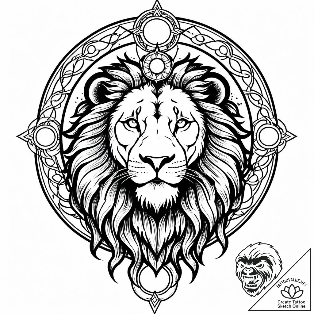 This blackwork tattoo sketch presents a majestic lion's face, framed by a celestial halo and intricate circular motifs, reminiscent of a sacred mandala. The pure linework and bold black areas create a powerful, graphic aesthetic, evoking a sense of divine strength and timeless wisdom.