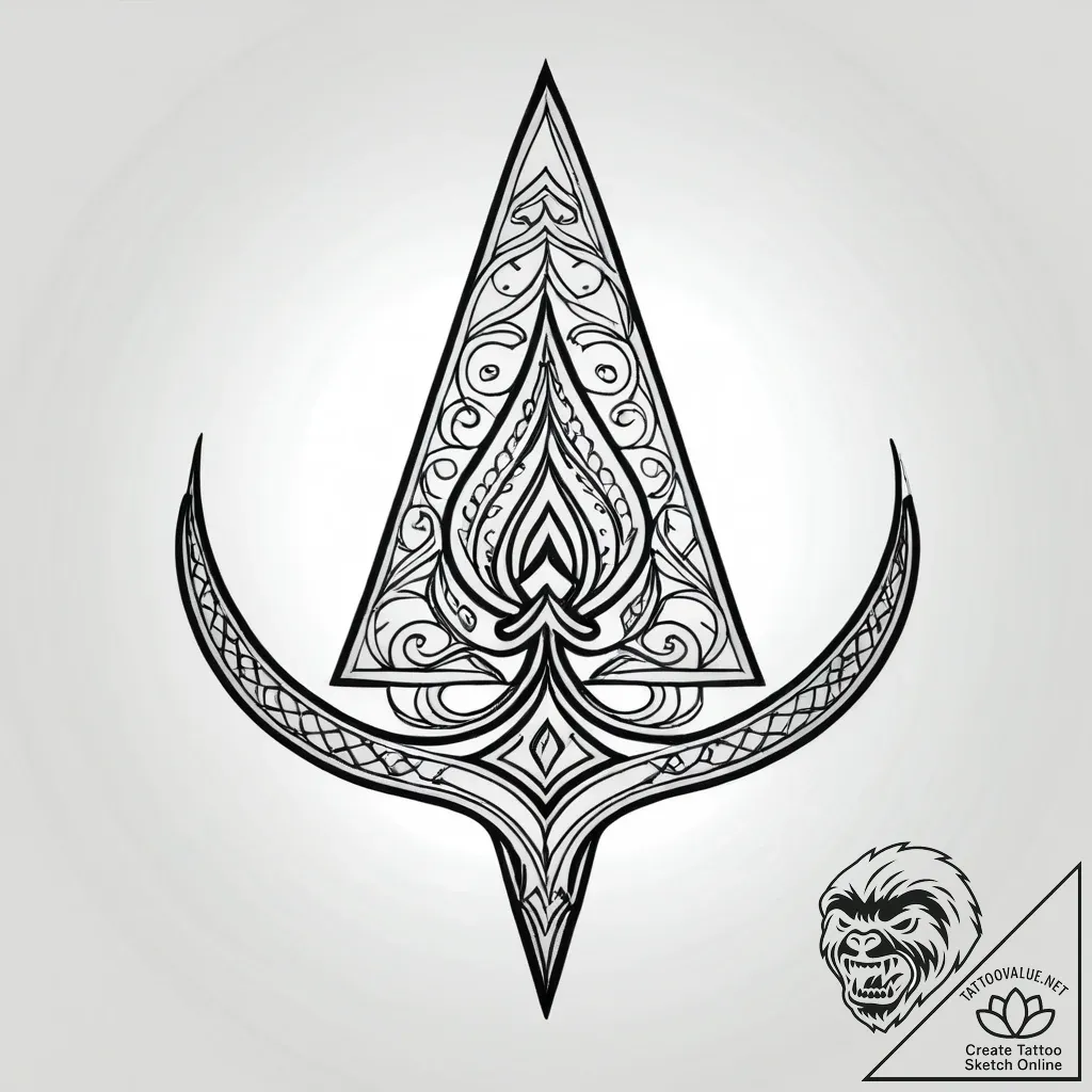 This design is a masterful fusion of sharp geometric forms and flowing ornamental patterns, reminiscent of a stylized spearhead adorned with intricate filigree. The central triangular element, filled